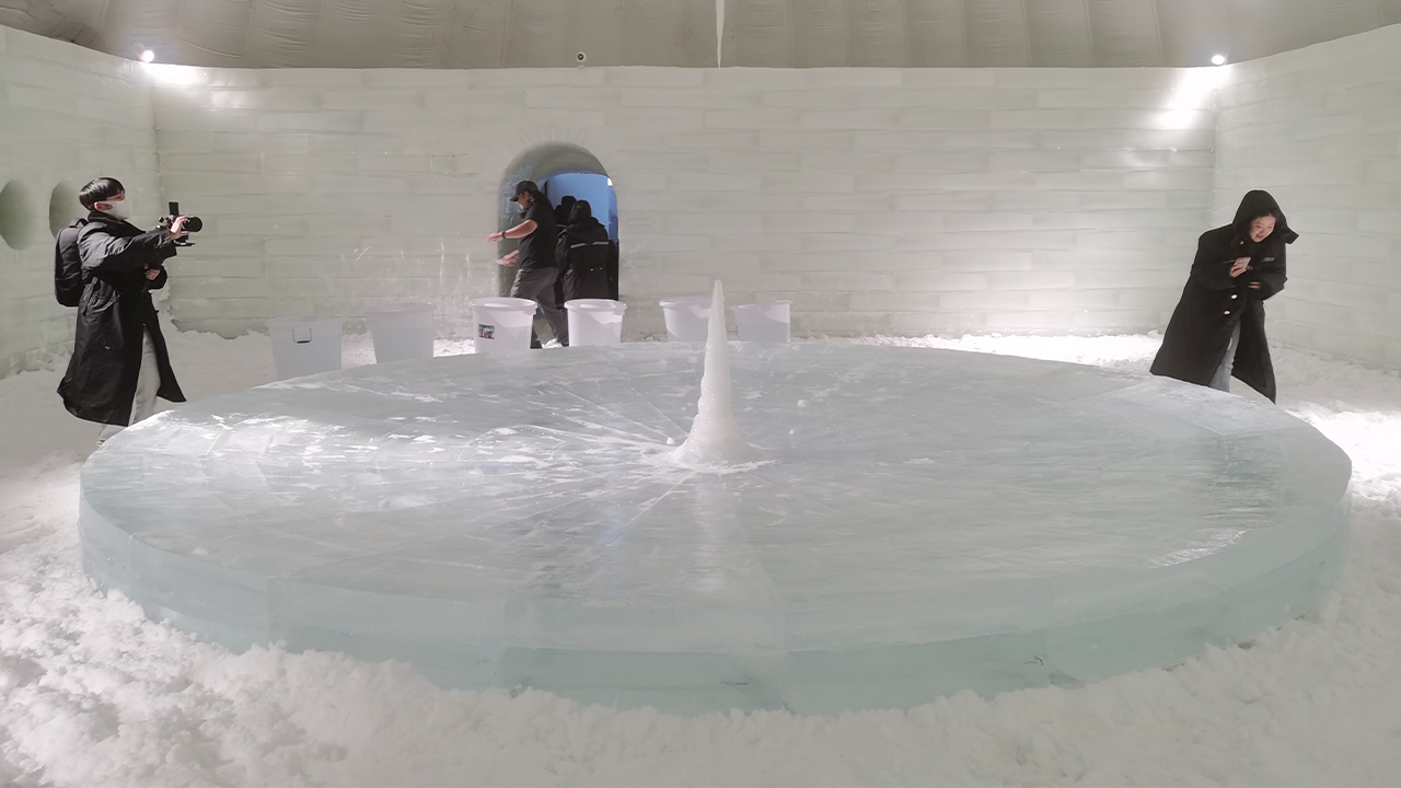 Shen stammt ursprünglich aus Nordostchina und schöpfte aus seinen persönlichen Erinnerungen an den Norden, um diese eindringliche Winterlandschaft in zwei riesigen aufblasbaren Membrankonstruktionen zu erschaffen. Im Mittelpunkt stehen Schnee, Eis und Wasser – die Ausstellung fängt den Rhythmus und die Ausdehnung des Winters ein. Sie verwischt die Grenze zwischen Natur und Künstlichkeit, zwischen Realität und Erinnerung, und lädt die Besucher ein, den Winter nicht bloß als Jahreszeit zu erleben, sondern als etwas, das man körperlich spürt und in sich trägt.